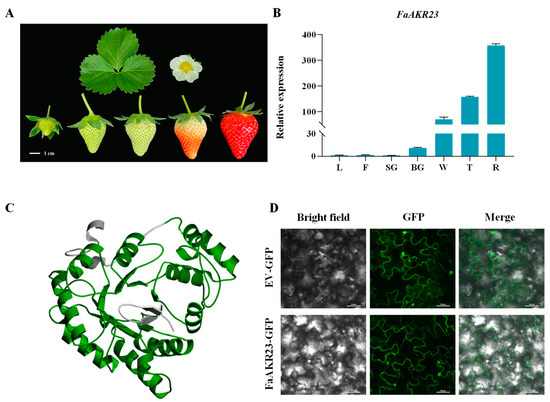 To investigate the potential function of FaAKR23, we firstly examined the FaAKR23 transcription levels in different tissues of octoploid strawberry F. × ananassa cv. ‘Sweet Charlie’ (Figure 2A). As shown in Figure 2B, FaAKR23 transcript levels were present at much lower levels in leaves and flowers than in fruits, and its expression increased extremely during fruit development until ripening; this implies that FaAKR23 might be involved in strawberry fruit ripening and quality formation. In addition, the protein structure predicted by SWISS-MODEL showed that the FaAKR23 protein folds into a TIM barrel structure, which is highly conserved during evolution [41] (Figure 2C).