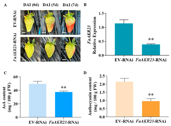 Transient silenced expression of FaAKR23 in strawberry fruits. (A) Phenotypes of EV-RNAi and FaAKR23-RNAi fruits; EV, empty vector; scale Bars: 1 cm. (B) The expression levels of FaAKR23 in EV-RNAi and FaAKR23-RNAi fruits. Expression values are means ± SEMs of three biological replicates and are normalized using FaCHP1 as an internal control. (C) AsA content in EV-RNAi and FaAKR23-RNAi fruits. (D) Anthocyanin content in EV-RNAi and FaAKR23-RNAi fruits. Statistically significant differences from control were determined by Student’s t-test: ** p < 0.01. Values are means ± SEMs of three biological replicates.