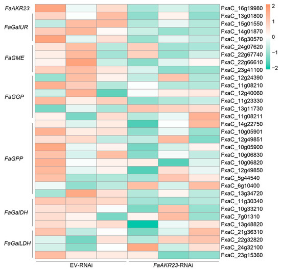 Expression profiles of AsA metabolism-related genes differently expressed between EV-RNAi and FaAKR23-RNAi fruits.