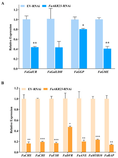 To decipher the molecular mechanisms underlying FaAKR23-mediated AsA and anthocyanin accumulation in strawberry fruits, we performed transcriptome deep sequencing (RNA-seq) using EV-RNAi and FaAKR23-RNAi fruits. FDR < 0.01 and fold change ≥ 2 were set as the threshold for significantly differential expression (Figure 4 and Figure 5). We also validated the expression of several genes of interest by qRT-PCR (Figure 6). These results showed that the AsA biosynthetic genes, such as FaGalUR, FaGME, and FaGGP (Figure 4), and anthocyanin-synthesis-related genes, such as FaCHS, FaCHI, FaF3H, FaDFR, and FaANS, as well as FaMYB10 and FaRAP, were significantly downregulated (Figure 5).