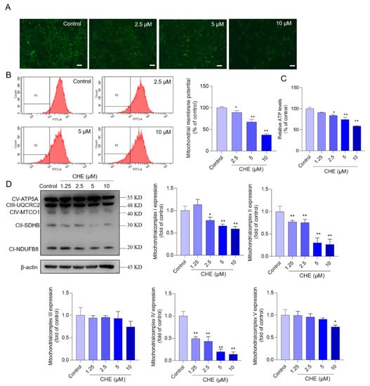 3.4. CHE Treatment Induces Mitochondrial Dysfunction