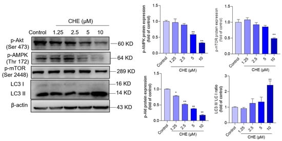 3.6. CHE Treatment Inhibits AMPK/Akt Pathway