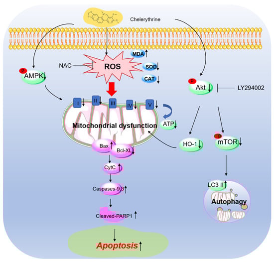 Lin Y, Zhang Q, Xie B, Jiang H, Shen J, Tang S, Dai C. Chelerythrine-Induced Apoptotic Cell Death in HepG2 Cells Involves the Inhibition of Akt Pathway and the Activation of Oxidative Stress and Mitochondrial Apoptotic Pathway. Antioxidants. 2022; 11(9):1837. https://doi.org/10.3390/antiox11091837