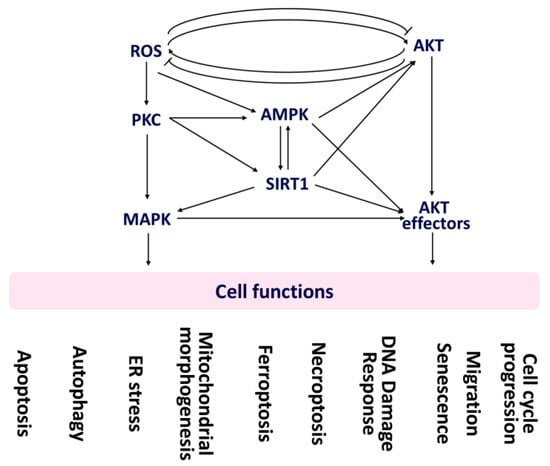 The involvement of oxidative stress-modulating AMPK, SIRT1, and MAPK in several functions was mentioned in Table 2. Notably, AMPK, SIRT1, and MAPK can regulate cell-cycle progression. Metformin causes G1 arrest of leukemia cells depending on AMPK activation and cyclin D1 down-regulation [76]. AMPK [77] and SIRT1 [79] also regulate the phosphorylation of CDK inhibitor p27kip1. Moreover, SIRT1 governs cell-cycle progression by modulating acetylation and phosphorylation of checkpoint kinase 2 (CHK2) [78]. SIRT1 silencing causes G1 arrest, accompanied by down-regulating CDK2/4/6 [80]. MAPK can modulate cell-cycle arrest [81]. MAPK is also tightly regulated with cyclin-dependent kinase (CDK) to control cell-cycle progression [82].