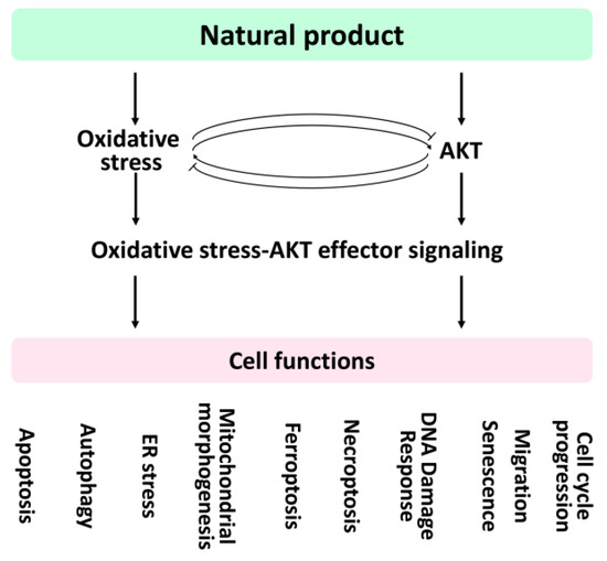 Natural products may generate oxidative stress [30] and modulate AKT expression [31,32] in cancer cell treatments. However, the potential regulation of cell functions by natural product-modulating oxidative stress and AKT pathway (AKT and AKT effectors) lacks systemic understanding. The modulating effects of natural products on oxidative stress and the AKT pathway will be discussed later.