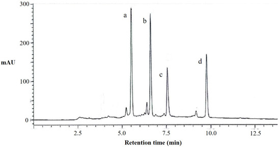 HPLC chromatograms at 330 nm of flavonoids from perilla leaves. a, apigenin 7-O-caffeoylglucoside; b, scutellarein 7-O-diglucuronide; c, luteolin 7-O-diglucuronide; and d, scutellarein 7-O-glucuronide.