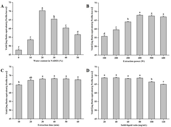 The extraction yields of total flavonoids from perilla leaves with different influencing factors. Invariant extraction conditions: 300 W, 20 min, and 100 mg/mL (A); 30%, 20 min, and 100 mg/mL (B); 30%, 300 W, and 100 mg/mL (C); and 30%, 300 W, and 20 min (D). Data sharing the different letters were significantly different (p < 0.05).