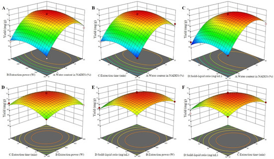 The 3D surfaces of the Box–Behnken design for NADES-MAE optimization. Water content in the NADES and extraction power (A); water content in the NADES and extraction time (B); water content in the NADES and solid–liquid ratio (C); extraction power and extraction time (D); extraction power and solid–liquid ratio (E); and extraction time and solid–liquid ratio (F).