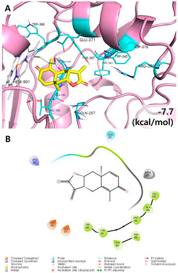 One of three types of NOS proteins, iNOS is a key protein in the synthesis of NO along with L-arginine and cofactors [21]. To investigate the inhibitory effect of yomogin on NO synthesis, the molecular docking calculation was conducted between iNOS and yomogin. The lowest energy conformation showed that yomogin has the good binding affinity with iNOS (−7.7 kcal/mol, RMSD < 1.0). Hydrophobic pocket was observed in this conformation with residues TRP340–VAL346 and TRP366–TYR367, suggesting that they contribute in iNOS binding via non-hydrogen bonding interaction. Two negative charge interactions with GLU371 and ASP376 as well as one positive charge interaction with ARG382 were observed. A polar interaction with residue GLN257 were also found in the present simulation (Figure 3). This finding indicated that yomogin inhibits the NO production by binding to the iNOS protein.