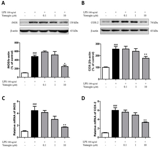 Effects of yomogin on expressions of iNOS and COX-2 in LPS-stimulated BV2 microglial cells. The cells were treated with various concentrations (0.1–10 µM) of yomogin for 1 h before LPS treatment. The protein levels of iNOS (A) and COX-2 (B) were determined by Western blotting (n = 5–6 per group). The mRNA levels of iNOS (C) and COX-2 (D) were analyzed by qRT-PCR (n = 6 per group). Data were analyzed by one-way ANOVA, followed by Tukey’s post hoc test. ### p < 0.001 compared to the control group; * p < 0.05 and ** p < 0.01 compared to the LPS-only-treated group. Values are the mean ± SEM.