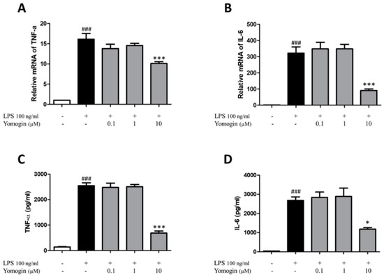 Effects of yomogin on secretion of TNF-α and IL-6 in LPS-stimulated BV2 microglial cells. The cells were pre-treated various concentrations (0.1–10 µM) of yomogin for 1 h before LPS treatment. The mRNA levels of TNF-α (A) and IL-6 (B) were measured by qRT-PCR (n = 4). The levels of TNF-α (C) and IL-6 (D) were analyzed in the supernatants by ELISA kit (n = 4 per group). Data were analyzed by one-way ANOVA, followed by Tukey’s post hoc test. ### p < 0.001 compared to the control group; * p < 0.05 and *** p < 0.001 compared to the LPS-only-treated group. Values are the mean ± SEM.