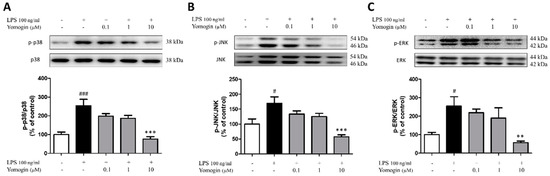 Effects of yomogin on MAPK signaling pathway in LPS-stimulated BV2 microglial cells. Cells were pre-treated with various concentrations (0.1–10 µM) of yomogin for 1 h before LPS treatment. The protein levels of p-p38, p38 (A), p-JNK, JNK (B) and p-ERK, ERK (C) were examined by Western blot analysis (n = 4–6 per group). Data were analyzed by one-way ANOVA, followed by Tukey’s post hoc test. # p < 0.05 and ### p < 0.001 compared to the control group; ** p < 0.01, *** p < 0.001 compared to the LPS-only-treated group. Values are the mean ± SEM.