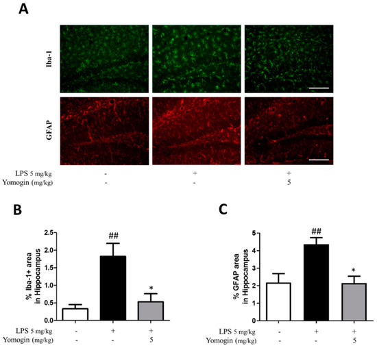 Next, we investigated the impact of yomogin on microglial and astrocyte activation in vivo. We performed immunofluorescence using Iba-1 antibody to detect activated microglia. The LPS-injected group showed an increased Iba-1-positive area compared to the control group in the hippocampus and cortex. However, the proportion of Iba-1-positive area was significantly decreased in the yomogin-treated group compared to the LPS group in the same region (Figure 7). In addition, astrocyte activation was measured by GFAP antibody used as a marker for astrogliosis. This data suggests that yomogin inhibits LPS-induced microgliosis and astrogliosis in the mouse brain.