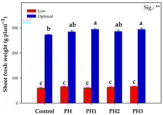 Furthermore, significant biostimulant × nitrogen dosage effects were also recorded. In the optimal nitrogen group, both the H1 and H3 treatments were the best performing and recorded the highest shoot fresh weight, which translated into a 7.5% mean increase compared to their untreated control. Although PH and PH3 increased the shoot fresh weight by 9.0% compared to the control, the differences were not deemed significant in the suboptimal nitrogen group.