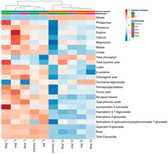 To provide a visual representation of the changes in phytochemical contents after the application of the biostimulant treatments, we have performed a hierarchical clustering analysis coupled with a heatmap, which can be seen in Figure 2.