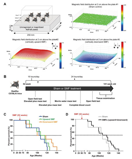 Moderate quasi–uniform SMF long–term exposure prolongs mice lifespan. (A) A diagram of the mice cage placed on sham control vs. two different magnetic plates that provide vertically upward and downward direction SMFs. Magnetic flux densities were scanned at 2 cm above the plates; (B) experimental design flow chart; (C,D) the survival rate of naturally aged mice. The survival rate recorded for naturally aged mice in vertically upward or downward SMF exposure groups was analyzed separately (C) or grouped together as SMFs (D). n = 8 mice for the sham control, upward SMF or downward SMF group in the beginning of the experiment.