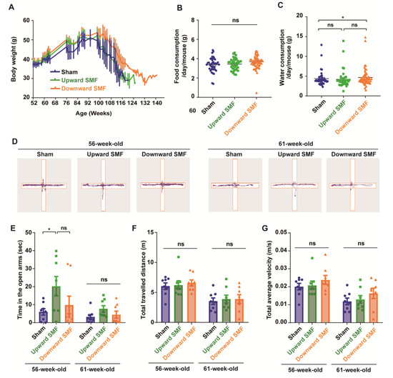 In the meantime, to monitor the overall health status of the mice, we also examined their body weight, as well as their food and water consumption. Our results indicated that the body weight was slightly increased in the downward SMF group, but in general, the SMF-induced body weight changes were negligible (Figure 2A and Figure S1). In addition, the SMF treatment had no apparent effects on the food consumption of mice (Figure 2B and Figure S1). The water consumption was slightly increased in the downward SMF group (Figure 2C). Moreover, we also measured the complete blood count at 95 weeks old (after 43 weeks of SMF exposure) and found that SMFs did not induce statistically significant differences (Table 1 and Figure S2).