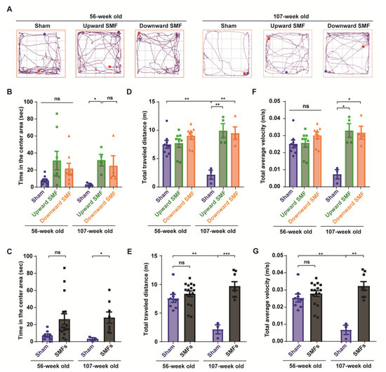 Open field test shows that SMFs could significantly improve the exploratory and locomotive activities of aged mice. (A) Representative trajectories of mice in the open field test at 56 and 107 weeks old. The blue and red points show start and end points, respectively; (B,C) time in the center area, (D,E) total traveled distance, (F,G) total average velocity were recorded and analyzed in a blinded way. Mice in the upward or downward SMF exposure groups were analyzed separately (B,D,F) or grouped together as SMF group (C,E,G). n = 8 mice for the sham, upward SMF or downward SMF group in the beginning of the experiment. Values were expressed as means ± SEM. * p < 0.05, ** p < 0.01, and *** p < 0.001 by Student’s t-test. ns, no significance.