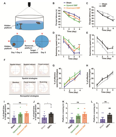Morris water maze test shows that SMFs could improve spatial learning ability and spatial memory of aged mice. (A) Illustration of Morris water maze device, (B,C) escape latency during the spatial acquisition training days, (D,E) swimming speed during the spatial acquisition training days, (F) different types of search strategies during the spatial acquisition training days, (G,H) the percentage of effective searching strategies during the spatial acquisition training days, (I,J) the percentage of dwell time in the target quadrant during the probe trial, (K,L) platform crossing during the probe trial were recorded and analyzed in a blinded way. Mice in upward or downward SMF exposure groups were analyzed separately (B,D,G,I,K) or grouped together as SMF group (C,E,H,J,L). n = 6–8 mice for the sham, upward SMF or downward SMF group. Values were expressed as means ± SEM. * p < 0.05, ** p < 0.01, *** p < 0.001, and **** p < 0.0001 by Student’s t-test. ns, no significance.