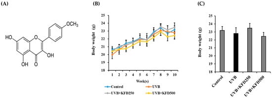 The topical administration of kaempferide (KFD) did not affect body weight. (A) Chemical structure of the KFD used in this study. (B) Body weight changes of each mouse group over 10 weeks (n = 6). (C) Body weight of each mouse group at the end of the experiments (n = 6). All data are expressed as the mean ± standard error of the mean (SEM). There were no significant differences between groups.