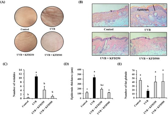 Six-week-old C57BL/6 (female) mice were purchased from Raonbio Inc. (Seoul, Korea). Animals were habituated for one week in a pathogen-free animal house under a 12 h light/dark cycle at a constant temperature of 23 ± 2 °C, with 50 ± 10% humidity. Mice were randomly divided into the following four groups: non-treated (control, n = 6), UVB-irradiated (UVB, n = 6), UVB-irradiated with pre-treatment using KFD 250 μM (UVB + KFD250, n =6) and UVB-irradiated with pre-treatment using KFD 500 μM (UVB + KFD500, n = 6). The KFD was dissolved in glycerol: ethanol: H2O (5:3:2). Each solution (100 µL) was treated to the dorsal region of the mice skin every other day for 10 weeks. UVB was irradiated using a BIO-LINK 312 UVB irradiation system (VILBER Co., Seoul, Republic of Korea). The dorsal hair of the mice was shaved once a week. The mice were exposed to UVB between one MED (one MED = 50 mJ/cm2) and six MED every other day for 10 weeks, and the total amount of UVB irradiation was 94.5 MED (4725 mJ/cm2). One MED is defined as the minimum dose of radiation required to form an erythema with sharp margins after 24 h. After finishing 10 weeks of UVB exposure, the mice’s skin was photographed and the number of wrinkles was counted under a digital microscope (Nikon, Tokyo, Japan).