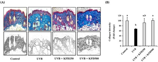 UVB-induced loss of epidermal collagen content was attenuated by kaempferide (KFD). (A) The skin of each mouse group (n = 6) was isolated at the end of the experiments and stained with Masson’s trichrome staining solution (upper panel), and the collagen contents, which were stained blue, were converted to black using the ImageJ program (lower panel). Scale bar: 100 µM. (B) The intensity of the collagen contents was estimated using the ImageJ program and tabulated. All data are expressed as the mean ± standard deviation (SD). Different letters (a and b) indicate the significant differences between groups (p < 0.05).