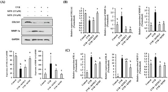 As shown in Figure 6A, the administration of non-toxicological levels of KFD (up to 5 µM) recovered the downregulation of COL1A1 and increased the MMP-1a protein on the NIH-3T3 cells irradiated with UVB. These findings were further confirmed by using qRT-PCR. The UVB-mediated abnormal expression of COL1A1, MMP-1a and MMP-3 genes was restored by KFD treatments in NIH-3T3 cells (Figure 6B). In addition, we found that the UVB-mediated increase of proinflammatory cytokine genes (IL-6, IL-8 and MCP-3) was significantly (p < 0.05) attenuated by KFD treatment in NIH-3T3 cells (Figure 6C). These results suggest that administration of non-toxicological levels of KFD could effectively attenuate the UVB-mediated abnormal expression of COL1A1, MMPs and proinflammatory cytokines (MCP-3, IL-8 and IL-6) in NIH-3T3 cells.