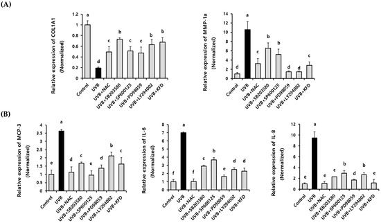In addition, we found that the administration of MAPK and AKT-specific inhibitors (10 µM) (SB203580: JNK inhibitor, SP600125: p38 inhibitor, PD98059: MEK inhibitor, and LY294002: PI3K inhibitor) significantly (p < 0.05) restored the UVB-mediated abnormal expression of photoaging-related genes (MMP-1a, MMP-3, COL1A1, MCP-3, IL-8 and IL-6) in NIH-3T3 cells (Figure 8). Interestingly, 5 uM of KFD showed an equal extent of efficacy as a 10 uM of MAPK or AKT inhibitor in restoring the UVB-mediated photoaging genes in NIH-3T3 cells (Figure 8). These results suggest that MAPKs and AKT play critical roles in KFD-mediated anti-photoaging activity by restoring the UVB-induced abnormal expression of photoaging-related genes.