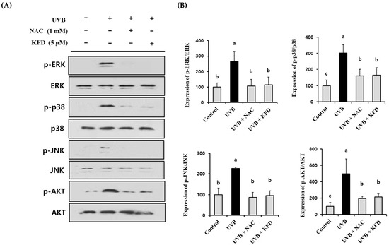 Mitogen-activated protein kinases (MAPKs) and protein kinase B (AKT) have been shown to be a key intracellular regulator in several disease processes, such as inflammation, apoptosis and photoaging [16,17,18,19]. UVB-induced ROS accumulation activates MAPKs and AKT signaling, and is critical in regulating the expression of disease-related genes, which is important in halting disease progression. In fact, UVB irradiation induces ROS generation, sequentially activating MAPKs and AKT in the skin, resulting in the abnormal expression of photoaging-related genes, such as COL1A1 and metalloproteinases (MMPs) [10,20,21,22]. It was reported that oral administration of p38 MAPK inhibitor could attenuate UVB-mediated photoaging processes [13]. These reports provide evidence that ROS-mediated signaling pathways act as key regulators in UVB-mediated photoaging processes and could be potential therapeutic targets in the development of anti-photoaging agents.