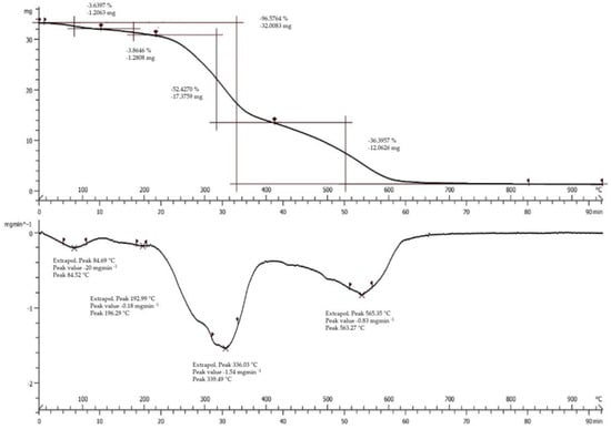 The thermal gravimetric analysis (TGA) curve of SD crickets is reported in Figure 3 (top panel). The TGA profile of SD crickets highlights a degradation in four stages. The first stage of the decomposition process shows the loss of free and loosely-bound water up to 180 °C (weight loss of 3.6%). The second stage of weight loss is from 180 °C to 310 °C (equal to 3.8%), followed by a third relevant stage from 310 °C to 520 °C, in which proteins and carbohydrates volatilize (weight loss of 52.4%), and finally the degradation of the resultant residues (weight loss of 36.4%).
