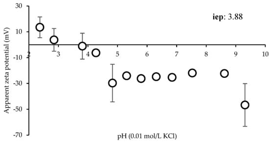Figure 4 shows the ζ in mV versus pH (9.0–2.0). The zeta potential changes from positive values (+13.48 ± 8.02 mV) to negative values (−46.68 ± 16.54 mV) as the pH increases from 2.3 to 9.3. From pH 2.3 to 3.8, ζ is positive, reaching the isoelectric point at pH 3.88. Moreover, ζ is negative at pH 4.3 (−6.28 ± 1.24 mV) and reaches a plateau above pH 4.8. This suggests that SD crickets should be positively charged during the gastric phase (pH 2–2.5) and negatively charged during the intestinal phase (pH 7).