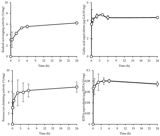 Free radicals are generated by unsuitable metabolic processes and could pose significant health problems, which can lead to a number of diseases including cancer, inflammation, and neurological conditions []. For this reason, the antioxidant properties of SD crickets were assessed through DPPH assay (direct evaluation), a free radical which has hydrogen acceptor capability, and via iron ions’ chelating properties (indirect evaluation), since iron is a well-known pro-oxidant which leads to the generation of free radicals from Fenton reactions. Figure 5 reports the antioxidant properties of the SD crickets as radical scavenging activity (top left panel), gallic acid equivalents (top right panel), ferrous ion chelating activity (bottom left panel), and EDTA equivalents (bottom right panel). The results show an increase in radical scavenging activity and gallic acid equivalents, and ferrous ions’ chelating activity and EDTA equivalents up to 24 h, suggesting a release of bioactive molecules which lead to an increased antioxidant capacity.