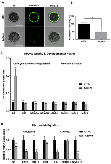 We start to check the quality of bovine oocytes upon exposure to juglone. Using the phalloidin-based staining, the fluorescence intensity corresponding to filamentous actin (F-actin) significantly decreased in matured oocytes after juglone exposure compared to the untreated control (Figure 1A,B).