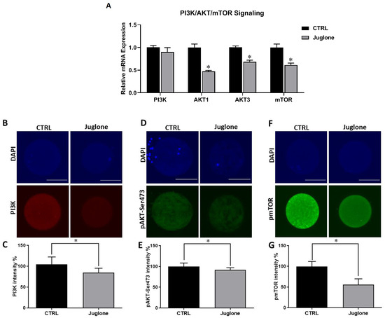 To clarify the possible mechanisms behind the deleterious effect of juglone on oocyte quality, we sought to investigate the PI3K/AKT/mTOR signaling pathway, a critical parameter controlling oocyte development and survival, at transcription and translation levels. The use of RT-qPCR revealed significant downregulation of AKT1, AKT3, and mTOR genes in juglone-treated oocytes (Figure 2A). Similarly, immunofluorescence analysis showed a dramatic decrease in expression of PI3K, pAKT, and pmTOR proteins in oocytes of the treated group compared to the control (Figure 2B–G).