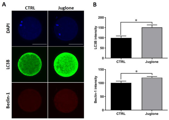 Checking the protein expression of the autophagy-related markers demonstrated significant increase in the levels of LC3B and beclin-1 in juglone-exposed oocytes compared to untreated ones (Figure 3A,B).