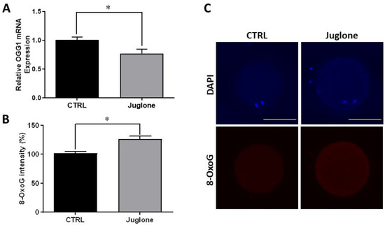 Since the PI3K/AKT/mTOR signaling plays a critical role in the control of the DNA repair mechanisms in several cell lines, we further executed to check the effect of juglone on DNA damage using the DNA damage-specific marker (8-Oxoguanine; 8-OxoG). In addition, the mRNA expression of 8-OxoG DNA Glycosylase-1 (OGG1), the gene responsible for 8-OxoG excision, was also inspected. As seen in Figure 4, the results of RT-qPCR and immunofluorescence reveal a significant decrease in the transcription pattern of OGG1 and overexpression of the 8-OxoG protein level, respectively, in treated oocytes.
