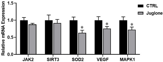 Finally, we demonstrated the impact of juglone treatment on the modulation of genes critical for oocyte survival (such as JAK2, SIRT3, SOD2, VEGF, and MAPK1). As seen in Figure 6, significant reduction in SOD2, VEGF, and MAPK1 genes was observed in the treated group as compared to control.