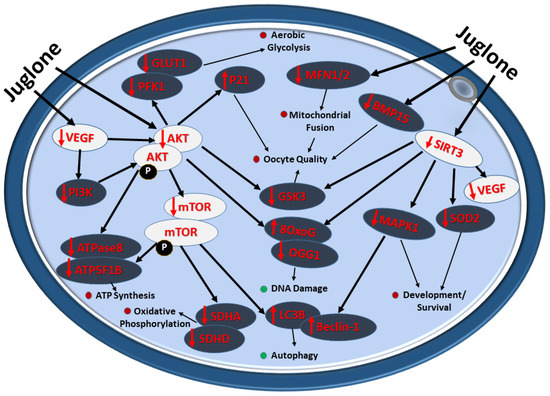 Diagram showing the deleterious impact of juglone implication on bovine oocyte during IVM. Juglone interact with the PI3K/AKT/mTOR signaling and the underlying cascades regulated by this pathway, the effects that negatively retard the development and quality of exposed oocyte. Red and green dots indicate the decrease and increase in the cellular processes affected by juglone in bovine matured oocyte, respectively.