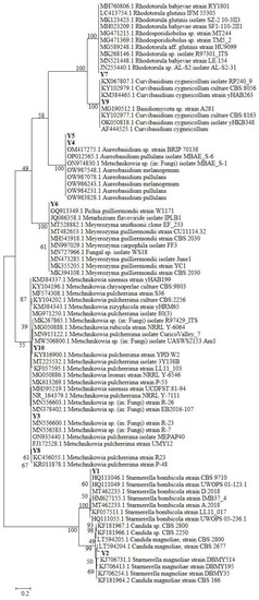 According to the NCBI blast database, the ten isolated yeasts were taxonomically related to seven different genera/species (Table 2), namely Starmerella bombicola (Y1), Candida magnoliae (Y2), Metschnikowia sp. (Y3, Y8, and Y10), Aureobasidium sp. (Y4 and Y5), Pichia guilliermondii (Y6), Rhodotorula sp. (Y7), and Curvibasidium sp. (Y9).