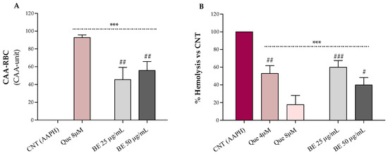 Effect of the bee pollen extract (BE 25 and 50 µg/mL) on the cellular antioxidant activity–CAA (A) and AAPH-induced oxidative hemolysis (B) on oxidized human erythrocytes. Quercetin (Que) was used as a standard. Results were expressed as mean ± SD. One-way ANOVA with Bonferroni’s Multiple Comparison test: * significantly different from control (CNT, CAA = 0), *** p < 0.001; # significantly different from Que 8 µM (corresponding to 2.4 µg/mL): # p < 0.05, ## p < 0.01, ### p < 0.001.