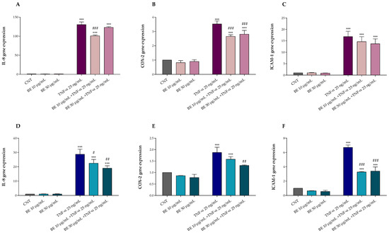 Effects of 1 h pre-treatment with bee pollen extract (BE 10 and 50 µg/mL) on HT-29 exposed 4 h (A–C) and 24 h (D–F) to 25 ng/mL TNF-α: (A,D) IL-8, (B,E) COX-2, and (C,F) ICAM-1 (Real-Time qPCR). One-way ANOVA with Dunnett’s Multiple Comparison test: * significantly different from control (CNT), *** p < 0.001; # significantly different from TNF-α: # p < 0.05, ## p < 0.01, ### p < 0.001.