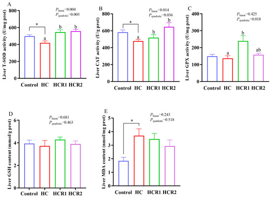 Liver T-SOD (A), CAT (B), and GPX (C) activities as well as GSH (D) and MDA (E) contents. Each data point represents the mean of four replicates (4 individuals per replicate). * Means p < 0.05, compared between the control and the HC group. ab Compared among the HC, HCR1, and HCR2 group. Bars assigned with different superscripts are significantly different (p < 0.05). Control, diet with 32% nitrogen-free extract; HC, diet with 45% nitrogen-free extract; HCR1, diet with 45% nitrogen-free extract and 0.04% resveratrol; HCR2, diet with 45% nitrogen-free extract and 0.08% resveratrol. MDA, malondialdehyde; CAT, catalase; GSH, L-glutathione reduced; GPX, glutathione peroxidase; T-SOD, total superoxide dismutase.