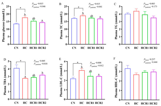 Plasma concentrations of glucose (A), TC (B), TG (C), TBA (D), LDL-C (E), and HDL-C (F). Each data point represents the mean of four replicates (4 individuals per replicate). * Means p < 0.05, compared between the control and the HC group. ab Compared among the HC, HCR1, and HCR2 groups. Bars assigned with different superscripts are significantly different (p < 0.05). Control, diet with 32% nitrogen-free extract; HC, diet with 45% nitrogen-free extract; HCR1, diet with 45% nitrogen-free extract and 0.04% resveratrol; HCR2, diet with 45% nitrogen-free extract and 0.08% resveratrol. TC, total cholesterol; TG, total triglycerides; TBA, total bile acid; HDL-C, high-density lipoproteins cholesterol; LDL-C, low-density lipoproteins cholesterol.
