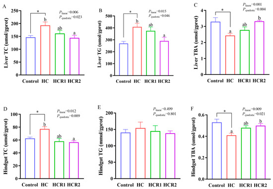Liver TC (A), TG (B), and TBA (C) contents as well as hindgut TC (D), TG (E), and TBA (F) contents. Each data point represents the mean of four replicates (4 individuals per replicate). * Means p < 0.05, compared between the control and the HC group. ab Compared among the HC, HCR1, and HCR2 group. Bars assigned with different superscripts are significantly different (p < 0.05). Control, diet with 32% nitrogen-free extract; HC, diet with 45% nitrogen-free extract; HCR1, diet with 45% nitrogen-free extract and 0.04% resveratrol; HCR2, diet with 45% nitrogen-free extract and 0.08% resveratrol. TC, total cholesterol; TG, total triglycerides; TBA, total bile acid.