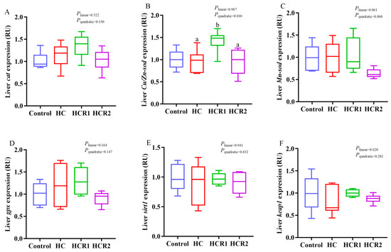Hepatic transcriptions of the genes involved in the antioxidant defense. The mRNA levels of catalase (cat) (A), copper/zinc superoxide dismutase (Cu/Zn-sod) (B), manganese superoxide dismutase (Mn-sod) (C), glutathione peroxidase (gpx) (D), sirtuin 1 (sirt1) (E), kelch-like ECH associating protein 1 (keap1) (F) were evaluated using real-time RT-PCR. Data are referred to the values (relative units, RU) obtained in fish fed the control diet. Each data point represents the mean of four replicates (4 individuals per replicate). ab Compared among the HC, HCR1, and HCR2 groups. Bars assigned with different superscripts are significantly different (p < 0.05). The first and third quartiles are represented by the top and bottom of the box, while the minimum and maximum values are represented by the whiskers. Control, diet with 32% nitrogen-free extract; HC, diet with 45% nitrogen-free extract; HCR1, diet with 45% nitrogen-free extract and 0.04% resveratrol; HCR2, diet with 45% nitrogen-free extract and 0.08% resveratrol.
