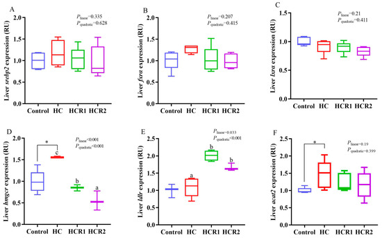 Hepatic transcriptions of the genes involved in cholesterol metabolism. The mRNA levels of sterol regulatory element-binding protein 2 (srebp2) (A), farnesoid X receptor α (fxrα) (B), liver X receptor α (lxrα) (C), 3-hydroxy-3-methyl-glutaryl coenzyme A reductase (hmgcr) (D), low-density lipoproteins receptor (ldlr) (E), acyl coenzyme A: cholesterol acyltransferase 2 (acat2) (F) were evaluated using real-time RT-PCR. Data are referred to the values (relative units, RU) obtained in fish fed the control diet. Each data point represents the mean of four replicates (4 individuals per replicate). * Means p < 0.05, compared between the control and the HC group. abc Compared among the HC, HCR1, and HCR2 groups. Bars assigned with different superscripts are significantly different (p < 0.05). The first and third quartiles are represented by the top and bottom of the box, while the minimum and maximum values are represented by the whiskers. Control, diet with 32% nitrogen-free extract; HC, diet with 45% nitrogen-free extract; HCR1, diet with 45% nitrogen-free extract and 0.04% resveratrol; HCR2, diet with 45% nitrogen-free extract and 0.08% resveratrol.