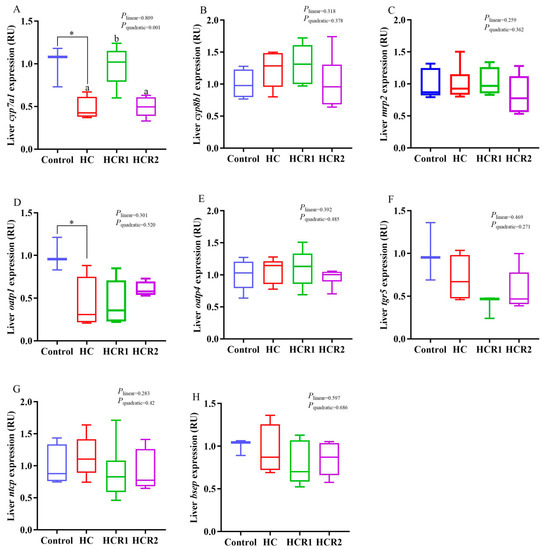 Hepatic transcriptions of the genes involved in bile acid metabolism. The mRNA levels of cholesterol 7α-hydroxylase (cyp7a1) (A), sterol 12α-hydroxylase (cyp8b1) (B), multidrug resistance associated protein 2 (mrp2) (C), organic anion-transporting polypeptide 1 (oatp1) (D), organic anion-transporting polypeptide 4 (oatp4) (E), takeda G-protein-coupled BA receptor (tgr5) (F), Na+-taurocholate cotransporter (ntcp) (G), bile salt export pump (bsep) (H) were evaluated using real-time RT-PCR. Data are referred to the values (relative units, RU) obtained in fish fed the control diet. Each data point represents the mean of four replicates (4 individuals per replicate). * Means p < 0.05, compared between the control and the HC group. ab Compared among the HC, HCR1, and HCR2 groups. Bars assigned with different superscripts are significantly different (p < 0.05). The first and third quartiles are represented by the top and bottom of the box, while the minimum and maximum values are represented by the whiskers. Control, diet with 32% nitrogen-free extract; HC, diet with 45% nitrogen-free extract; HCR1, diet with 45% nitrogen-free extract and 0.04% resveratrol; HCR2, diet with 45% nitrogen-free extract and 0.08% resveratrol.