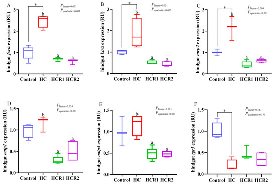 Relative transcriptions of the genes involved in cholesterol and bile acid metabolism in the hindgut. The mRNA levels of farnesoid X receptor α (fxrα) (A), liver X receptor α (lxrα) (B), multidrug resistance associated protein 2 (mrp2) (C), organic anion-transporting polypeptide 1 (oatp1) (D), organic anion-transporting polypeptide 4 (oatp4) (E), takeda G-protein-coupled BA receptor (tgr5) (F) were evaluated using real-time RT-PCR. Data are referred to the values (relative units, RU) obtained in fish fed the control diet. Each data point represents the mean of four replicates (4 individuals per replicate). * Means p < 0.05, compared between the control and the HC group. ab Compared among the HC, HCR1, and HCR2 groups. Bars assigned with different superscripts are significantly different (p < 0.05). The first and third quartiles are represented by the top and bottom of the box, while the minimum and maximum values are represented by the whiskers. Control, diet with 32% nitrogen-free extract; HC, diet with 45% nitrogen-free extract; HCR1, diet with 45% nitrogen-free extract and 0.04% resveratrol; HCR2, diet with 45% nitrogen-free extract and 0.08% resveratrol.
