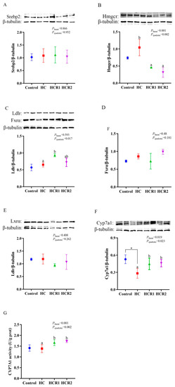 Protein levels of Srebp2 (A), Hmgcr (B), Ldlr (C), Fxrα (D), Lxrα (E), and Cyp7a1 (F) as well as the CYP7A1 (G) activity in the liver. Each data point represents the mean of four replicates (4 individuals per replicate). * Means p < 0.05, compared between the control and the HC group. ab Compared among the HC, HCR1, and HCR2 groups. Bars assigned with different superscripts are significantly different (p < 0.05). Control, diet with 32% nitrogen-free extract; HC, diet with 45% nitrogen-free extract; HCR1, diet with 45% nitrogen-free extract and 0.04% resveratrol; HCR2, diet with 45% nitrogen-free extract and 0.08% resveratrol. Srebp2, sterol regulatory element-binding protein 2; Hmgcr, 3-hydroxy-3-methyl-glutaryl coenzyme A reductase; Ldlr, low-density lipoproteins receptor; Fxrα, farnesoid X receptor α; Lxrα, liver X receptor; Cyp7a1, cholesterol 7α-hydroxylase.