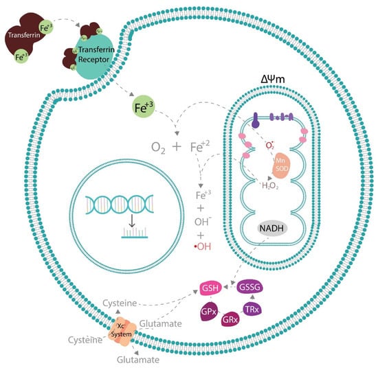 Endogenous antioxidants reactions with reactive oxygen species. MnSOD reacts with superoxide ion (O2−) converting it to hydrogen peroxide (H2O2). H2O2 diffuses to the cytoplasm and is converted to hydroxyl ion (OH−) via Fenton reaction with Fe2+. OH− cellular damage is prevented by glutaredoxin/thioredoxin, peroxidases (GPx, GRx, TRx), glutathione (GSH), and catalase (not shown). GSH is regenerated by nicotinamide adenine dinucleotide (NADH).